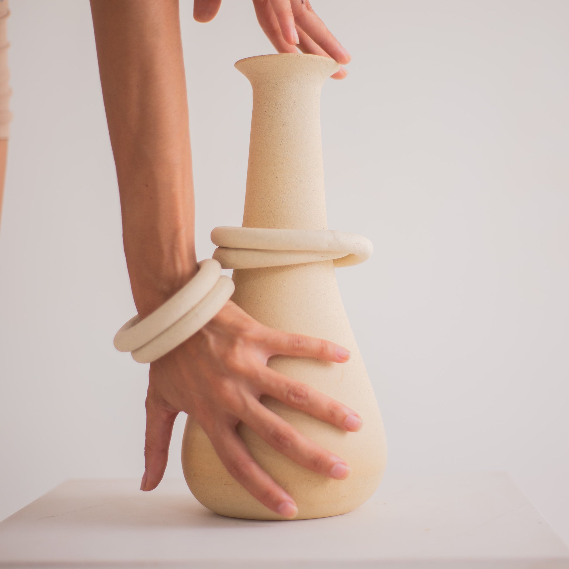 Produzido artesanalmente em cerâmica, o Vaso Elos é feito manualmente, peça a peça, sem o uso de moldes industriais. O processo evidencia o gesto manual e a construção cuidadosa dos anéis, resultando em variações sutis de forma, textura e tonalidade.